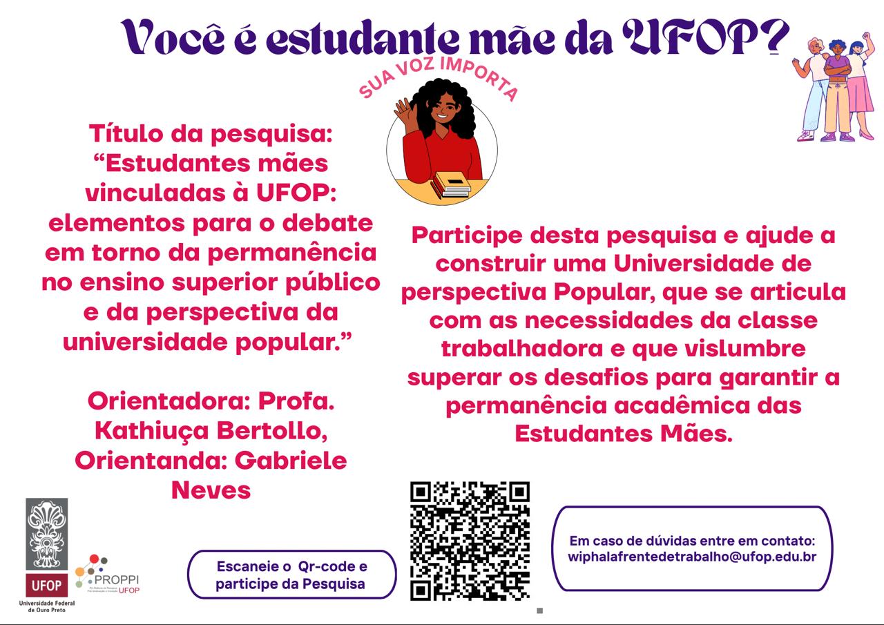 Nós, pesquisadoras da Universidade Federal de Ouro Preto (UFOP), convidamos as estudantes mães da UFOP a participar desta pesquisa que busca analisar a assistência estudantil, experiências vivenciadas, projetos no contexto da maternidade e relacionar essa pauta com a perspectiva da Universidade Popular.